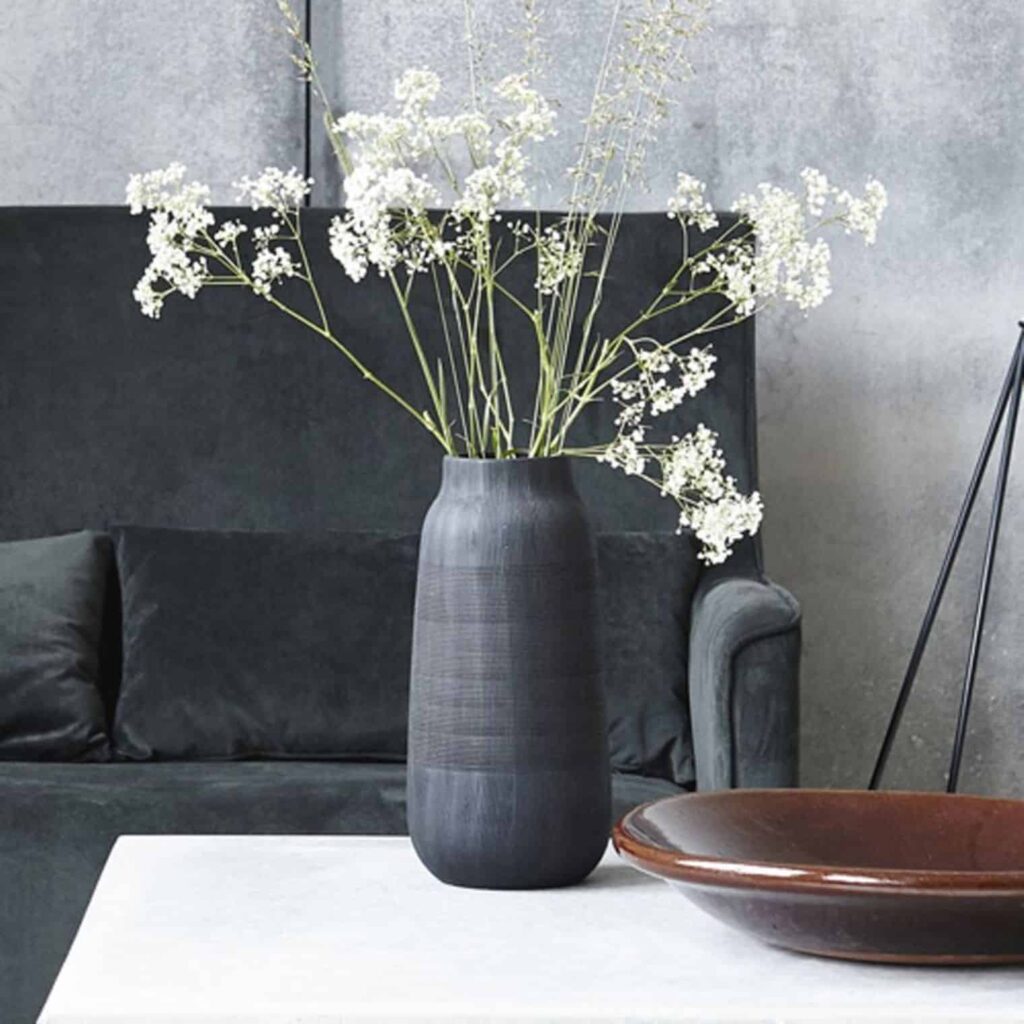 Sur la table basse, placez un grand vase garni de fleurs fraîches ou séchées. Ce détail insuffle une énergie nouvelle au salon et, clin d’œil pour les propriétaires d’animaux, met même en valeur votre compagnon à quatre pattes. Pour un rendu harmonieux, choisissez un vase dont la couleur rappelle celle du canapé.